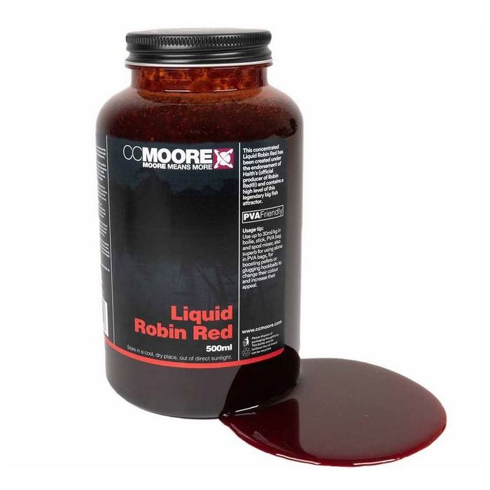 CC Moore Liquid Robin Red® is made with Haith’s Robin Red. Haith’s legendary Robin Red has been a key ingredient within some of the most successful Carp baits ever produced and is probably the most famous bait ingredient of them all. Its sweet, spicy taste and aroma, deep red colour and coarse oily texture all complement its powerful natural vitamin and trace element profile to make it a superb all round fish attractant. These great attributes are exactly why Robin Red has always been so effective within Carp and Coarse fish baits and are exactly why CC Moore & Co Ltd wanted to produce a genuine Liquid Robin Red with all the pulling power of the superb Haith’s Robin Red ‘meal’. This highly attractive new liquid has been developed to capture and maximise the natural attraction properties of Haith’s Robin Red and present them in an easy-to-use liquid form. The resulting product is this sweet, slightly spicy liquid that is thick, typically deep red in colour, extremely versatile and of course instantly attractive to Carp and most coarse fish – Liquid Robin Red. So whether you’re looking for a bag or stick mix liquid, a pellet soak, boilie soak, particle preparation additive or spod booster liquid, you can now take advantage of this totally natural, P.V.A.-friendly liquid which delivers the incredible natural attraction power of Robin Red. Liquid Robin Red is a completely natural product and does not contain any synthetic flavours. Supplied in a 500ml bottleMore Information