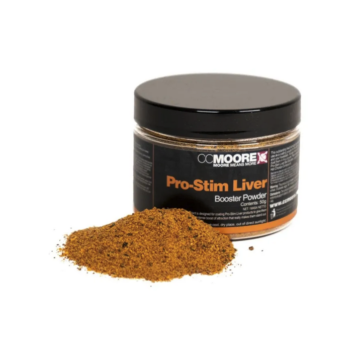 Pro-Stim Liver Booster Powder adds a highly attractive, crusty skin to your Pro-Stim Liver boilies or hookbaits which will gradually dissolve once immersed in water. Give your boilies or hookbaits a thin coating of your chosen liquid and then dust them in this highly attractive powder. This will make your boilies or hookbaits really stand out and help pull fish in to feed on them.