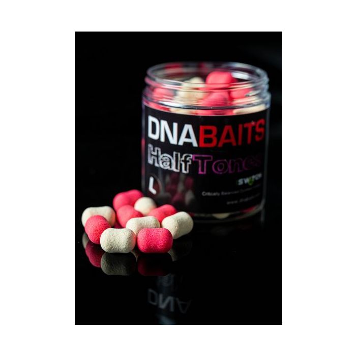 Through much trial and tribulation, DNA have managed to incorporate the optimum levels of liquid food used in their freezer baits and combine it with their wafter mix! All this together with slightly elevated flavour levels make the Half Tones a fantastic target hook bait, either fished over matching freebies or on their own. They come in a 14mm x 18mm dumbell shape and each tub contains a mixture of fluoro white and half toned pink hookbaits. As with the other fluoro dumbells in the range they are a firm but spongy structure. These wafters can easily be mounted by piercing or tying onto a hair and can be easily trimmed to suit your flavoured pattern/size of hook. As they come they balance a medium gauge size 8 pattern perfectly.