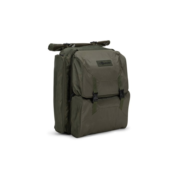 Additional storage comes from two full length zipped side pockets for banksticks or pods. Sculpted padded and adjustable shoulder straps ensure carrying comfort, the straps packing neatly away behind a wipe clean Velcro waterproof cover to protect them when the Ruckall is on the ground or on a barrow.