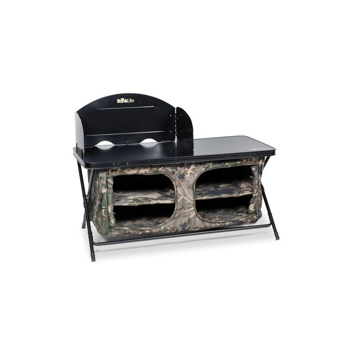 Ideal for social sessions and cooking with some creativity the Bank Life Cook Station has a folding three sided windshield that drops in on pins to give you a windproof area for kettles and stoves and also prevents items being blown off the table top when used as a work surface.