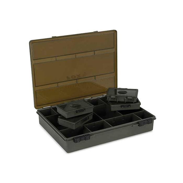 The Fox Loaded Tackle Box includes 1 x standard adjustable box, 1 x XL adjustable box, 1 x XL leader rack, 6 x hook boxes, 3 large dividers, 2 small dividers, 2 splitter dividers, 2 horizontal dividers, Sticker pack included.The fully loaded edition of the Fox Edges Large Tackle Box comes supplied with two accessory boxes, a leader rack plus 6 individual hook boxes.